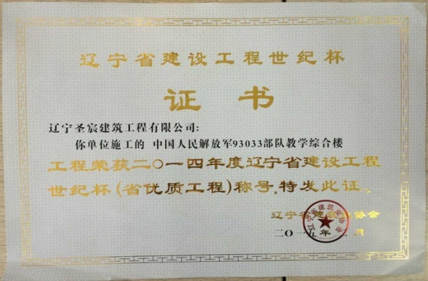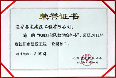 “93033部隊教學(xué)綜合樓”榮獲2011年度沈陽市“玫瑰杯”;2011~2012年度沈陽市“精品工程”;2014年度遼寧省優(yōu)質(zhì)工程“世紀(jì)杯” 稱號。