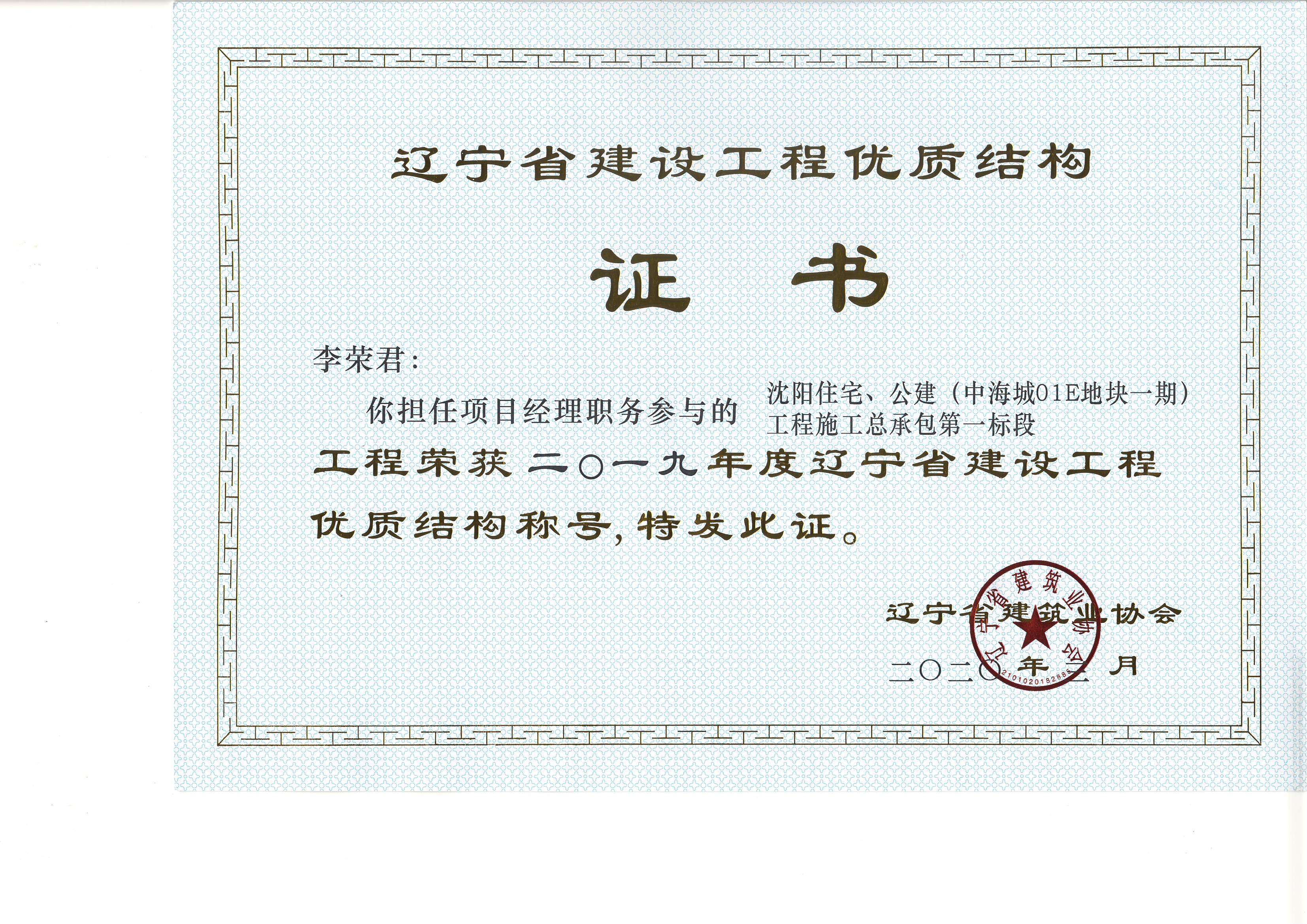 李榮君(項目經(jīng)理)-2019年度遼寧省建設(shè)工程優(yōu)質(zhì)結(jié)構(gòu)