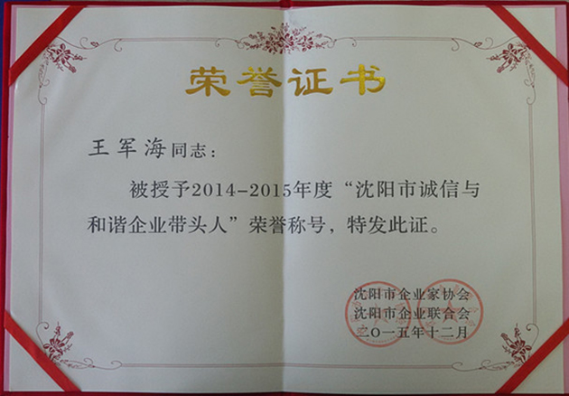 王軍海董事長(zhǎng)榮獲“沈陽(yáng)市誠(chéng)信與和諧企業(yè)帶頭人”榮譽(yù)稱號(hào)證書(shū)